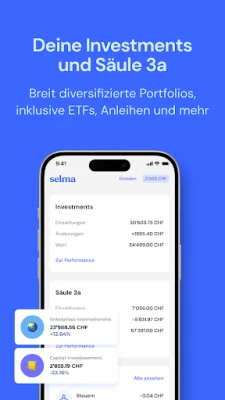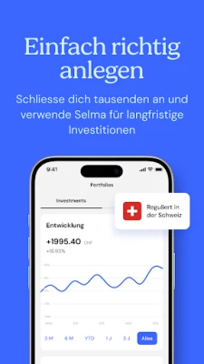 Noch nicht dabei? Selma transformiert Ihr Anlageerlebnis und macht den Vermögensaufbau zugänglich wie nie zuvor. Chatten Sie mit Selma, um einen individuellen Plan für Ihre Anlagen und Ihre Säule 3a zu erhalten, der perfekt auf Ihre aktuelle Lebens- und Finanzsituation zugeschnitten ist. Selma zeigt Ihnen nicht nur, wie Sie smart investieren, sondern auch, wie viel Sie beiseitelegen sollten und mit welchen Beträgen Sie den Start meistern. Die Eröffnung Ihres Anlagekontos inklusive sicherer Video-Identifikation sowie die mühelose Integration Ihrer Säule 3a erfolgt komplett digital. Starten Sie bereits ab 2'000 CHF mit einem globalen Investmentplan oder ab 500 CHF für Ihre Säule 3a.