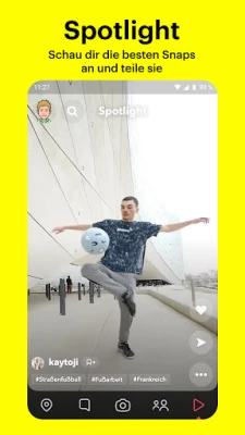 Entdecke im Spotlight die kreativsten und unterhaltsamsten Kurzvideos der Snapchat Welt. Ob du deine eigenen einzigartigen Momente teilen oder dich einfach zurücklehnen und die Highlights anderer genießen möchtest – die Bühne gehört dir. Markiere deine Favoriten und teile sie mühelos. Mit Snap Map behältst du den Überblick: Teile deinen Standort mit vertrauten Freunden oder aktiviere den Geistmodus für mehr Privatsphäre. Sieh, was deine Freunde gerade erleben, und entdecke Live-Storys aus deiner Nähe oder von der anderen Seite des Globus.